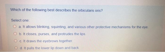 Solved Which Of The Following Best Describes The Orbicularis Chegg Com